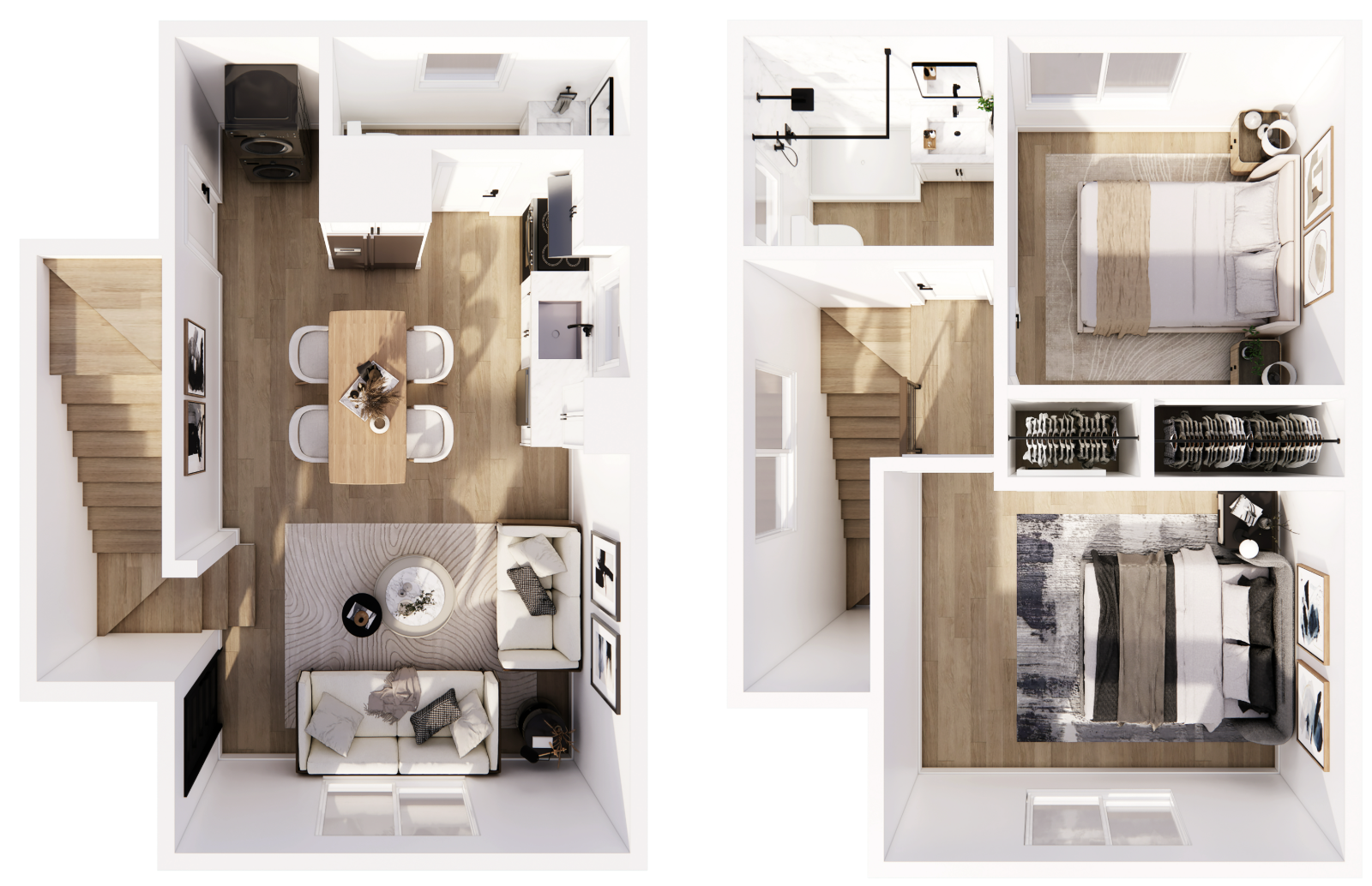 Designed for smart, space-efficient living, this 797 sq ft, two-story ADU features two bedrooms, one and a half bathrooms, and an open-concept kitchen and living area. It balances privacy and connection, making it ideal for rental income, a private retreat, or flexible home use. Thoughtfully designed, this plan maximizes livability while maintaining a compact, modern footprint perfect for most backyard lots.